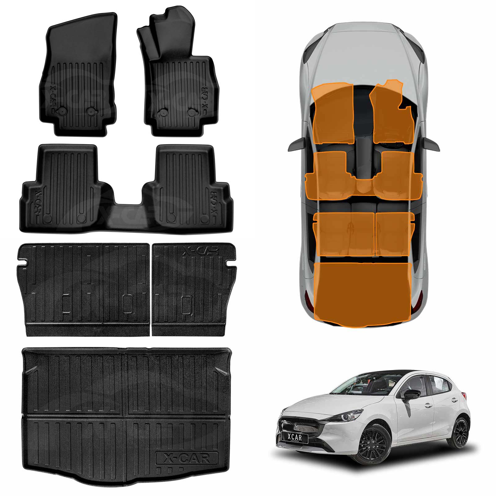 3D Floor Mats Boot Liner Set for Mazda 2 Hatch 2014-2025 DJ Series All Weather Heavy Duty Cargo Kick Mats Back Seat Protector Cover