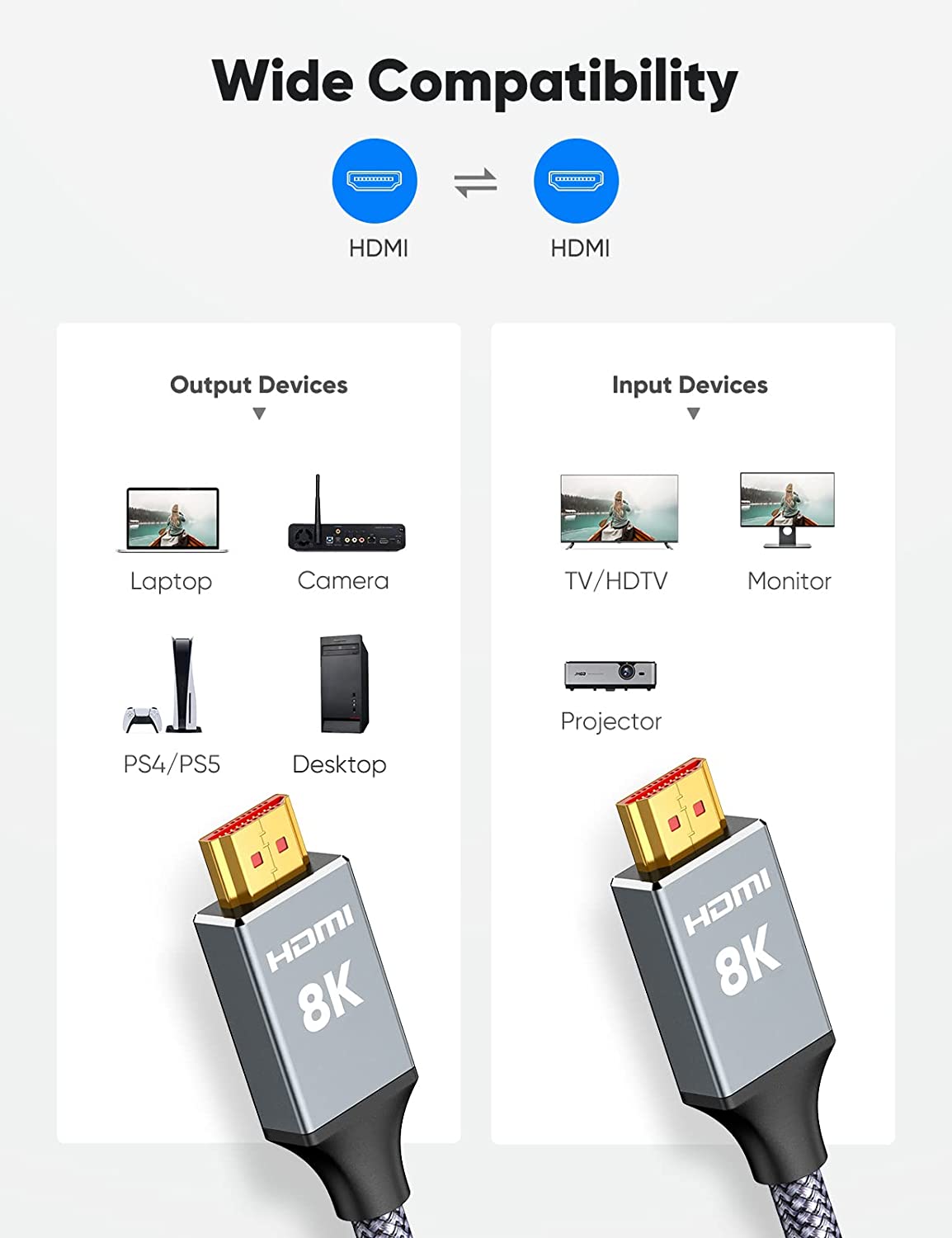 8K 60HZ HDMI Cable 2M 48Gbps High Speed HDMI Braided Cord 4K@120Hz UHD DTS:X, HDCP 2.2 & 2.3, HDR