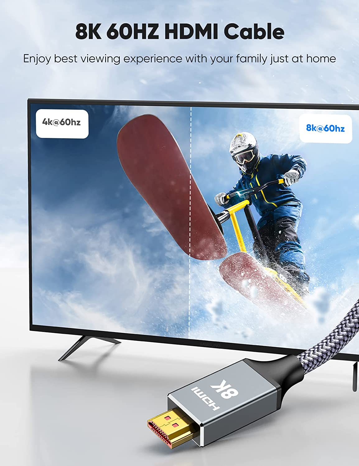 - Reinforced high-quality materials: This 8K HDMI Cable uses ELASO new technology, with a new smart chip, making it reach an unprecedented height. The strength of the aluminum alloy shell has been upgraded to make it more durable. The plug part is still made of 24K gold-plated material, which accurately transmits signals. The military grade tensile nylon material also greatly extends its life.