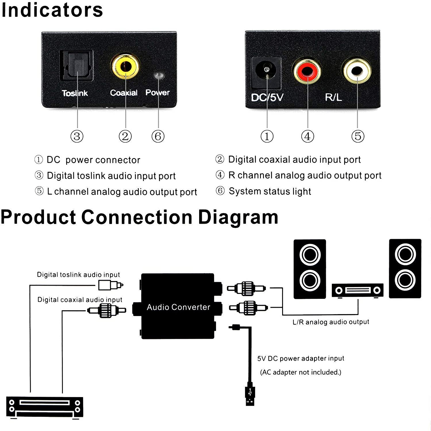 - Converts Coaxial or Toslink digital audio signals to analog L/R audio