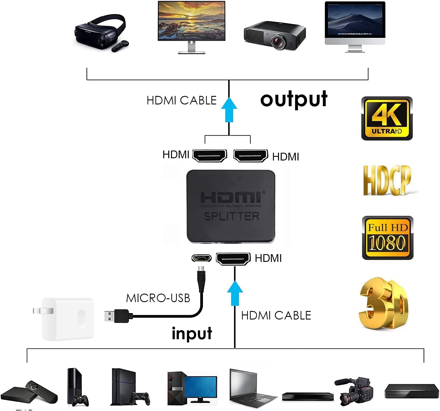 - PORTABLE - ELASO 4K HDMI Splitter 1 in 2 out, Compact design easy to use and carry, travel friendly. USB power cable included(it needs to be powered via usb), no need external driver, safety and Eco-friendly.