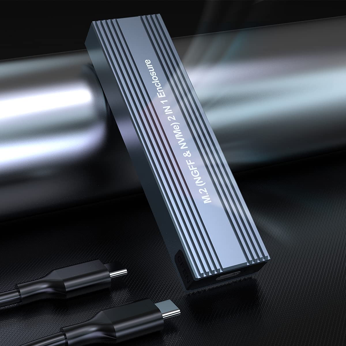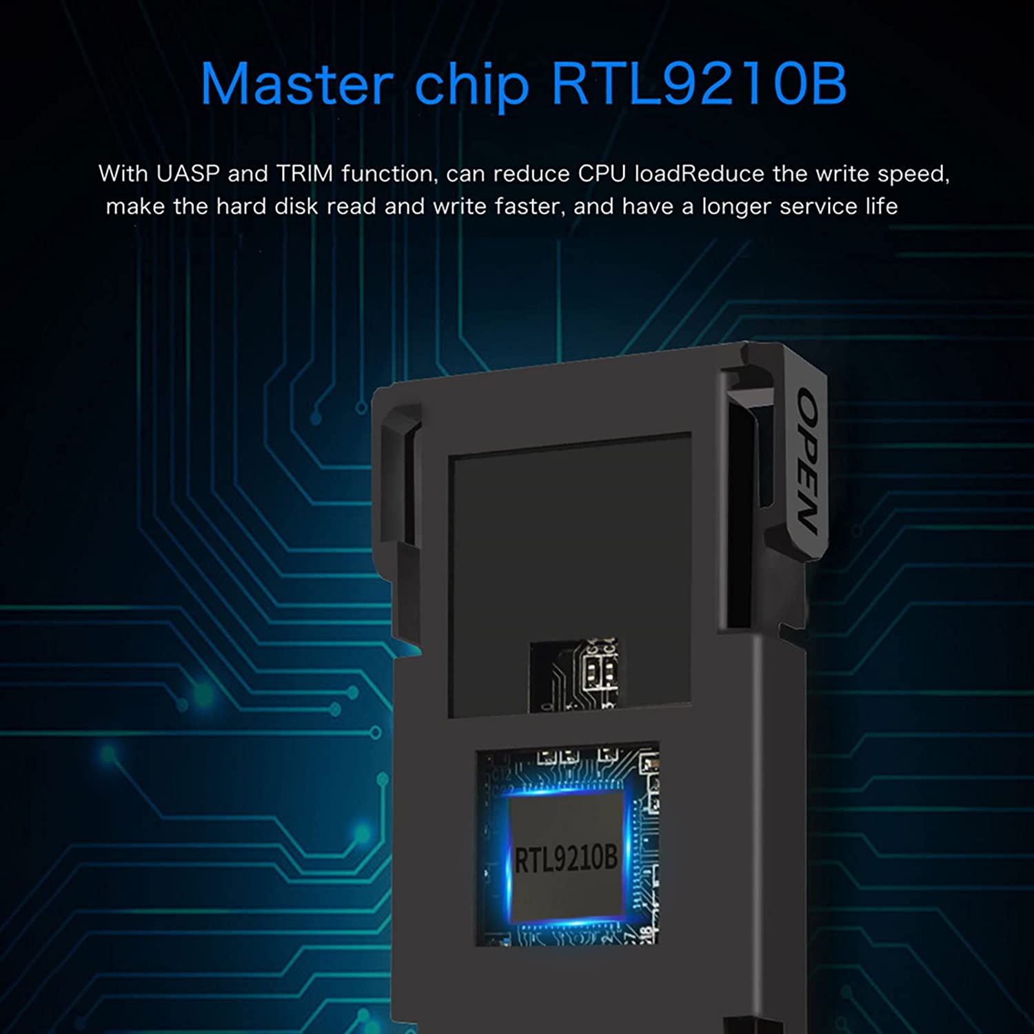 - Super Fast Data Transfer with RTL9210B : RTL9210B M.2 NVMe SATA Enclosure with USB3.1 GEN2 USB Type-C output interface, support UASP acceleration protocol, up to 2TB can be installed. The SSD equipped with NVMe protocol has a theoretical speed of 10Gbps, while the SSD equipped with NGFF (SATA) protocol has a theoretical speed 6Gbps,ultra-low power mode to prevent over-heating,for various platforms and PCIe/NGFF SSDs.