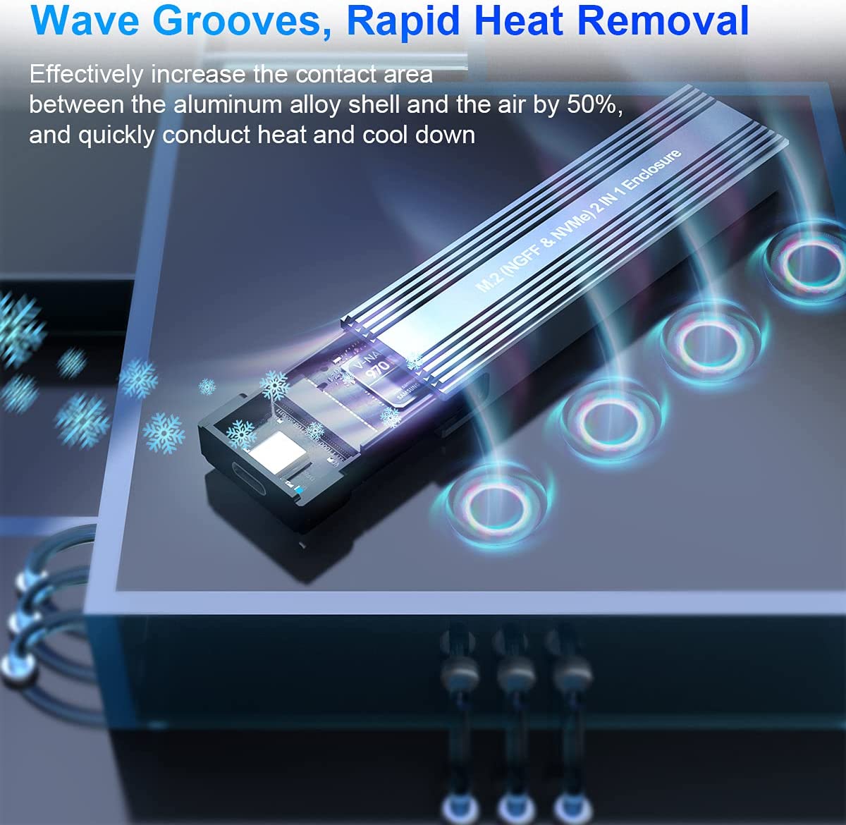 - Aluminum Hollow Out Construction & Tool-Free Design: M.2 SATA NVME Adapter SSD Case is made of exquisite aluminum. Effectively increase the contact area between the aluminum alloy shell and the air by 50%, and quickly conduct heat and cool down for your SSD.M.2 NVME & SATA SSD Enclosure. Just press 'Open' pull it gently to open the enclosure and insert your SSD into it, with no any other tools needed.