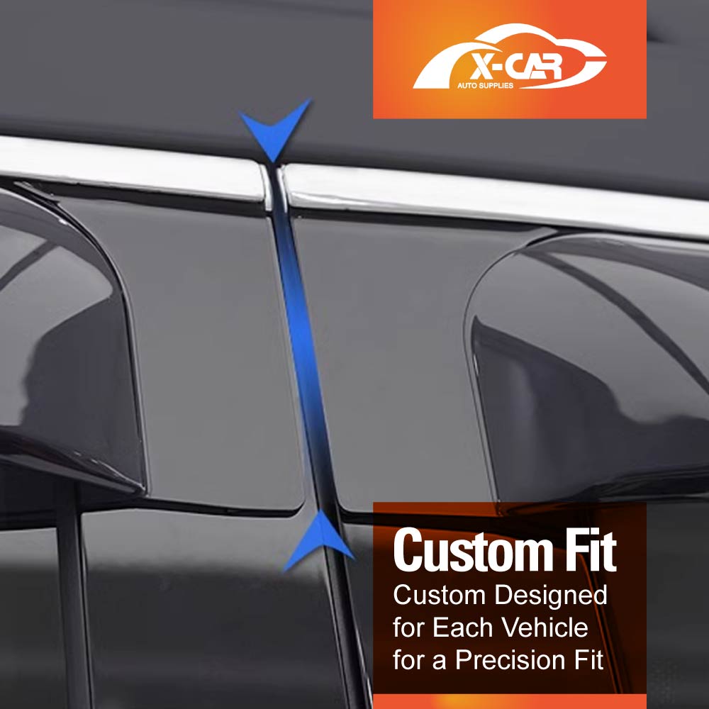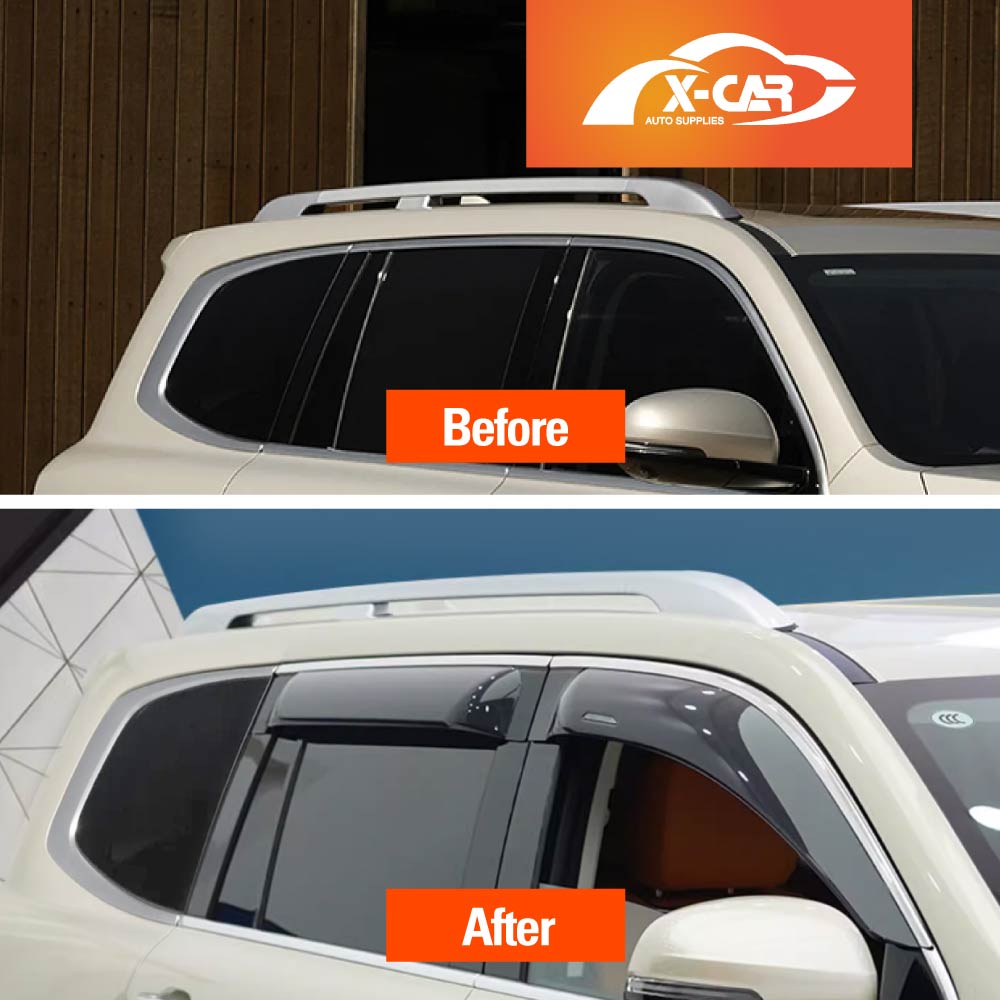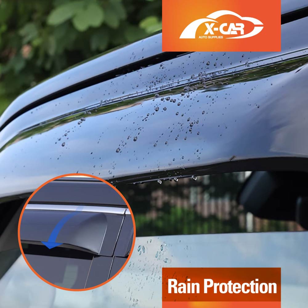 - Maximum Fresh Air Enjoyment. Let the fresh air in and keep the rain out! X-CAR side window visor spans the entire window channel, allowing you to open your windows and enjoy fresh air even when raining. It also reduces wind noise and minimizes turbulence with open windows.